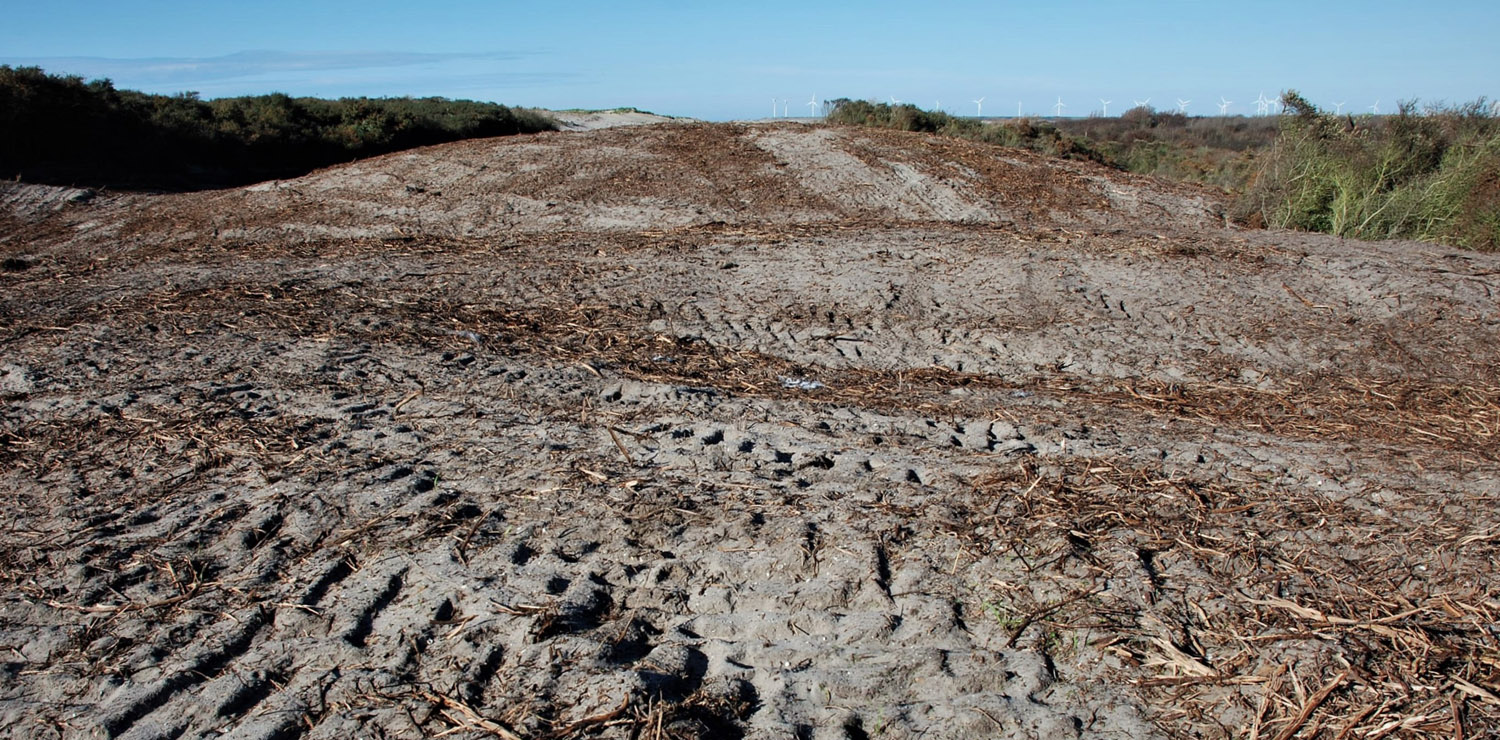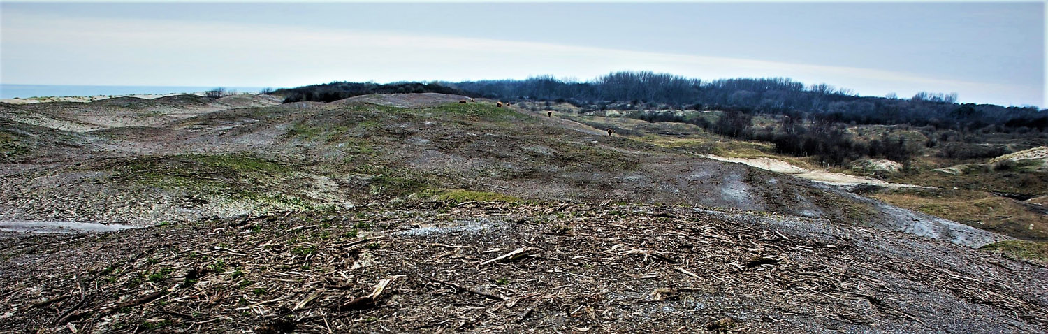 Stekelhoek, Voornes duin: Gebied aansluitend op de vorige foto richting het noord-westen. Door het grootschalig klepelen, de bodembeschadiging en het afzuigen van versnipperde struiken is de biotoop ongeschikt geworden voor de Nauwe korfslak. Door direct na de ingreep vee in te scharen is de kans groot dat de habitat ongeschikt blijft voor de Nauwe korfslak zolang deze begrazing uitgevoerd wordt.