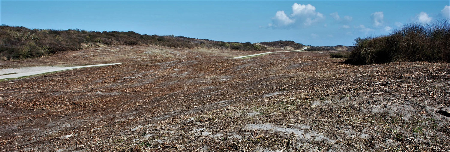 Grootschalig klepelen en afzuigen versnipperde struiken rond het Middelduinenpad op Goeree. In tegenstelling tot de Bunkervallei zijn hier geen refugia van struweel behouden op de klepelvlakten voor de Nauwe korfslak waardoor een groot leefgebied ongeschikt is geraakt.