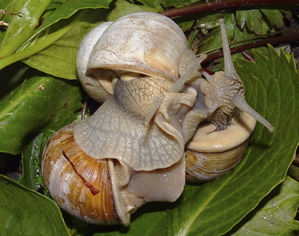 Ook het liefdesspel van slakken kan lang duren. Wijngaardslakken en tuinslakken stimuleren elkaar door de partner te prikken met puntige, kalkachtige 'liefdespijlen' (google het maar eens). Twee parende wijngaardslakken kunnen soms wel 24 uur hevig in elkaar opgaan, waarbij ze elkaar wederzijds bevruchten. Slakken zijn namelijk hermafrodiet: mannetje en vrouwtje tegelijk. Soms tref je zelfs een trio aan (foto hiernaast).