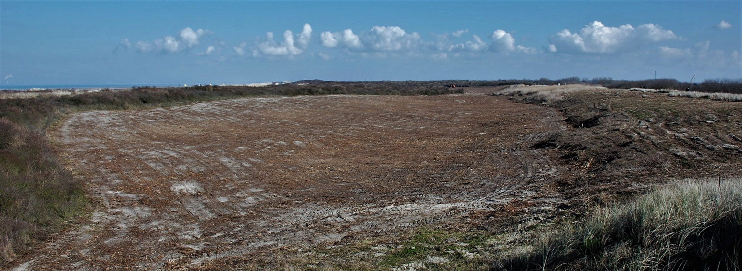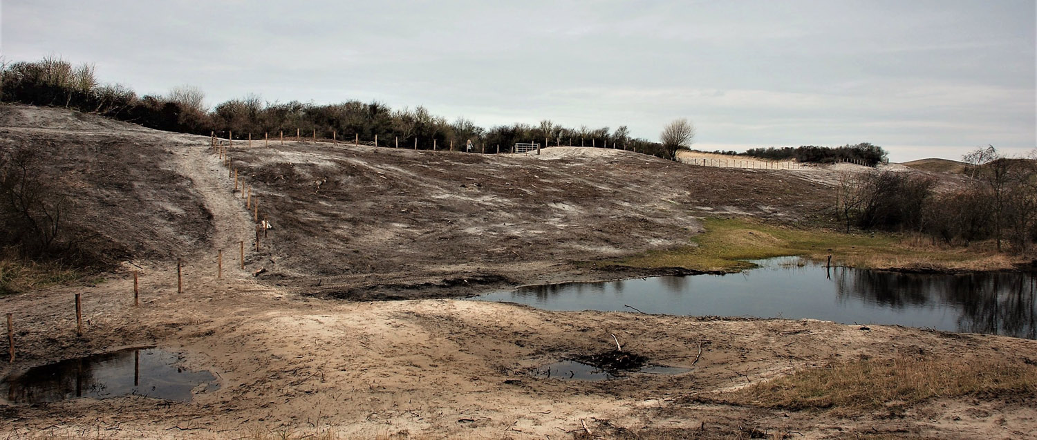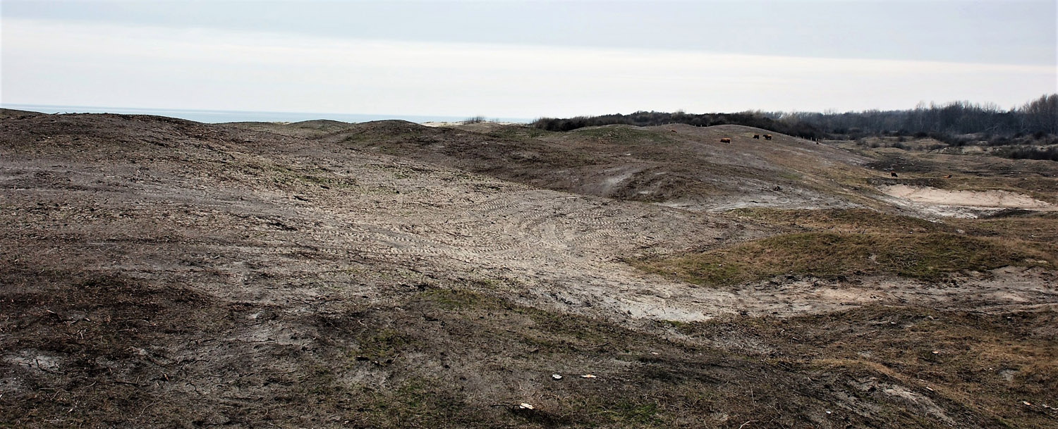 Stekelhoek, Voornes duin: Gebied aansluitend op de vorige foto richting het noord-westen. Door het grootschalig klepelen, de bodembeschadiging en het afzuigen van versnipperde struiken is de biotoop ongeschikt geworden voor de Nauwe korfslak. Door direct na de ingreep vee in te scharen is de kans groot dat de habitat ongeschikt blijft voor de Nauwe korfslak zolang deze begrazing uitgevoerd wordt.