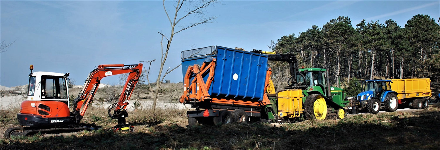 Met groot materieel worden gebieden geplagd en wordt het versplinterde struweel afgezogen zoals hier op de Kop van Schouwen maar ook In Voornes duin en duinen Goeree. Het met groot materieel werken veroorzaakt hevige bodembeschadiging wat ongunstig is voor veel terrestrisch levende dieren waaronder de Nauwe korfslak.