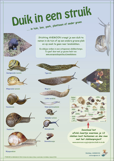 Stichting ANEMOON doet veel onderzoek in het 'mariene milieu' (de zee). Behalve mensen die op het strand het aanspoelsel tellen en onderzoeken wat er op pieren en strekdammen en elders langs de kust leeft, zijn er veel sportduikers bij onze projecten aangesloten. Bij het landslakken-project: 'Duik in een struik' verwijst de titel wel naar duiken, maar wees gerust, niemand hoeft te water. We vragen alleen of je een beetje om je heen wilt kijken en – vooral – wil letten op de twaalf soorten landslakken die staan afgebeeld op de poster en op het afvink-kaartje of lijstje dat bij het project hoort. Dat afvinken mag letterlijk, door een vinkje in een vakje op papier, maar het is veel makkelijker om waarnemingen digitaal door te geven. [In de huidige coronatijd is dit bovendien het veiligst.]